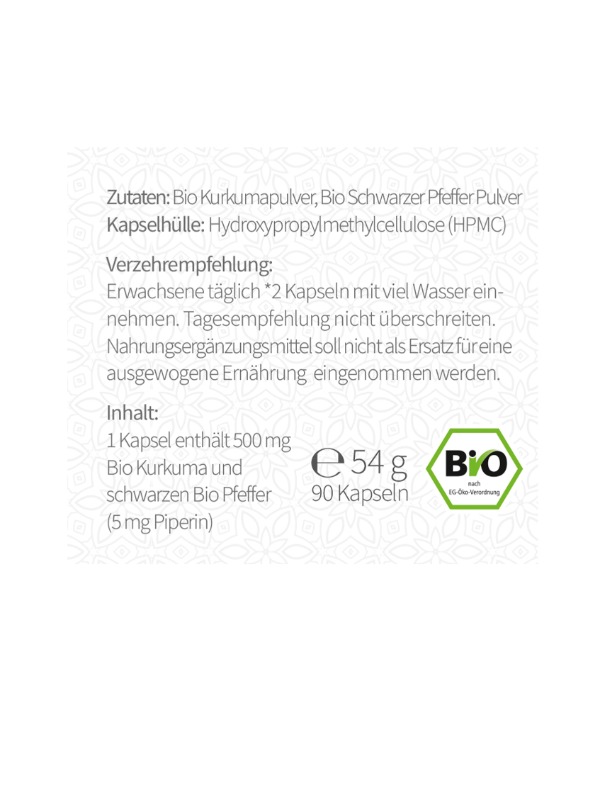 90 Kapseln = 54 g , 1 Kapsel enthält 500 mg Bio Kurkumapulver und Bio Schwarzer Pfeffer Pulver (Piperin)