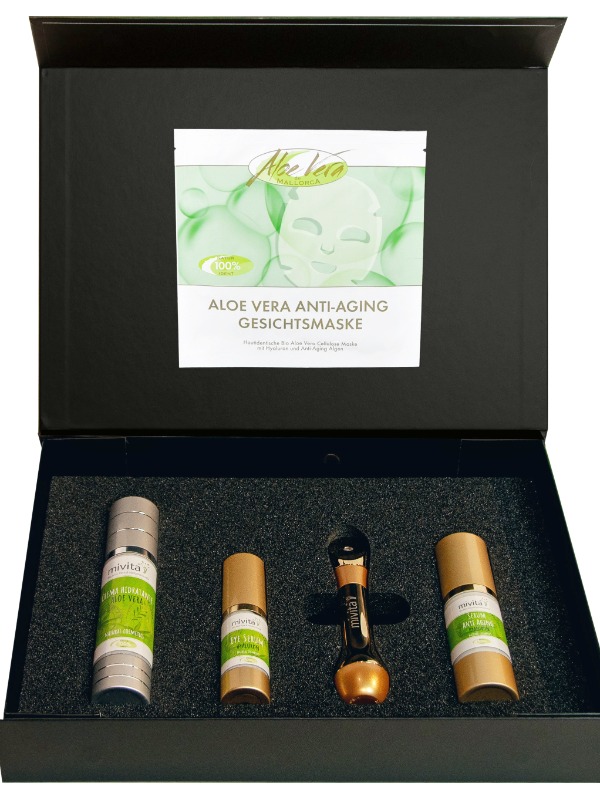 Gold Anti Aging Maske: Aloe Vera Anti-Aging Maske mit Oligo Hyaluron und Juvenessence Algen Extrakt für das beste Anti-Aging Ergebnis! Durch die Fermentation der Inhaltsstoffe, durch ein neuartiges Verfahren, erreichen wir in unserer Maske eine hautidentische laminare Struktur. So ist es dieser Anti Aging Maske möglich die enthaltenen Wirkstoffe deutlich schneller, tiefer und effektiver in die tieferen Hautschichten zu transportieren. Dadurch gelingt es sie schneller genau an die Stellen zu transportieren an denen sie ihre Wirkung schnellst- und bestmöglich entfalten können. Während der Fermentation lassen spezielle Mikroorganismen innerhalb von wenigen Tagen eine Art Bio-Zellulose entstehen, welches der köpereigenen Kollagenmatrix entspricht. Pflanzliche Membranlipide und Hyaluron bilden zusätzlich eine lamellare Struktur zwischen den Fasern, welche der hauteigenen Schutzbarriere entspricht. Hierdurch können überdurchschnittlich gute Anti Aging Effekte und Behandlungsergebnisse erzielt werden. Die natürliche Hautschutzbarriere wird dabei gestärkt und die Haut wirkt straffer und jugendlicher. Kein anderes kosmetisches Präparat kann soviel Feuchtigkeit und Wirkstoffe in die Haut transportieren wie unsere Aloe Vera Anti-Aging Maske. Feuchtigkeitsfaktoren und Hyaluronmoleküle gelangen durch die Bio-Membranmaske in tiefe Hautschichten und können dort ihre optimale Wirkung entfalten.